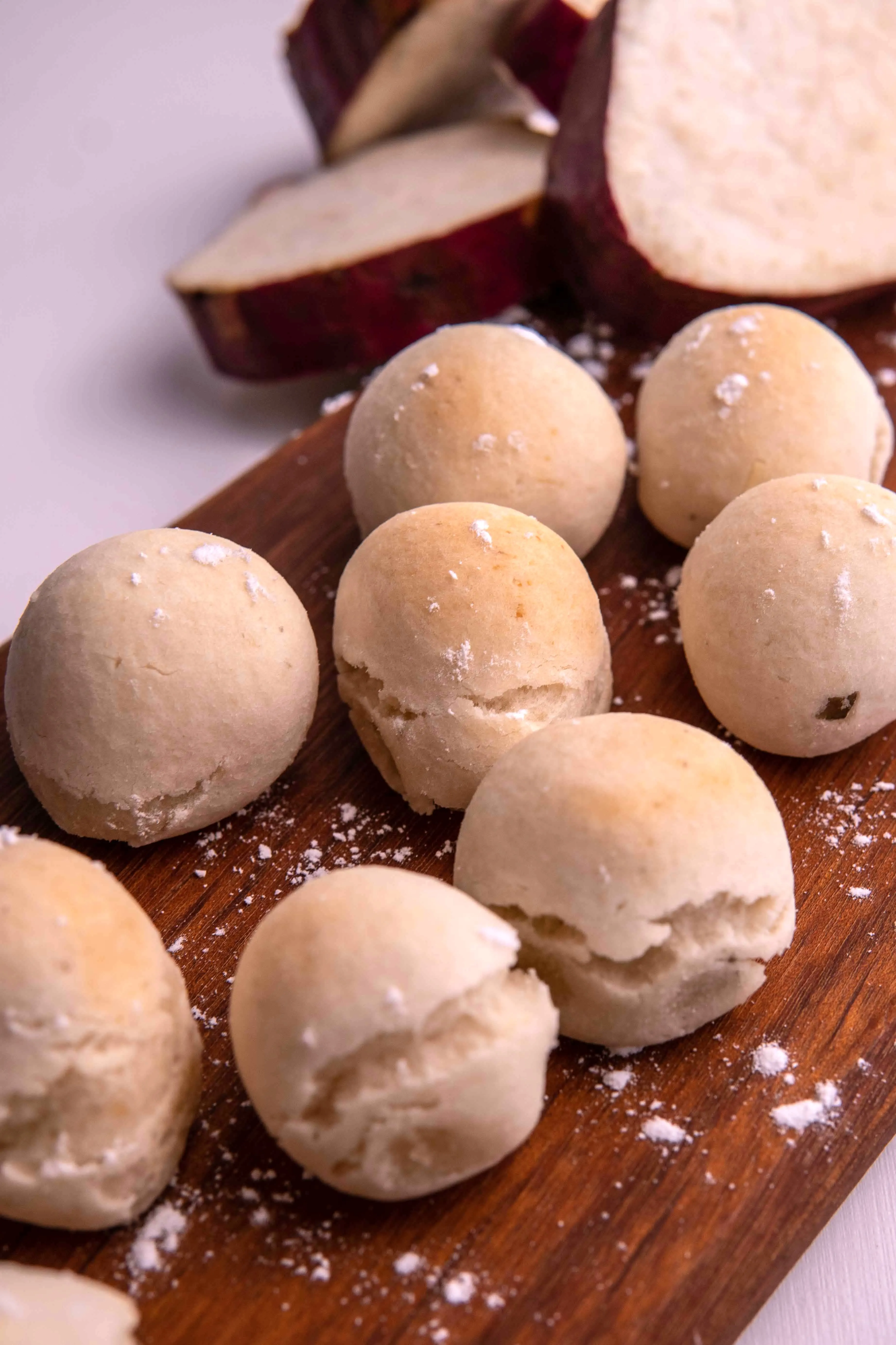 Ingredientes: batata doce, polvilho azedo, fécula de mandioca, queijo vegano à base de amido de batata, óleo de girassol e sal.