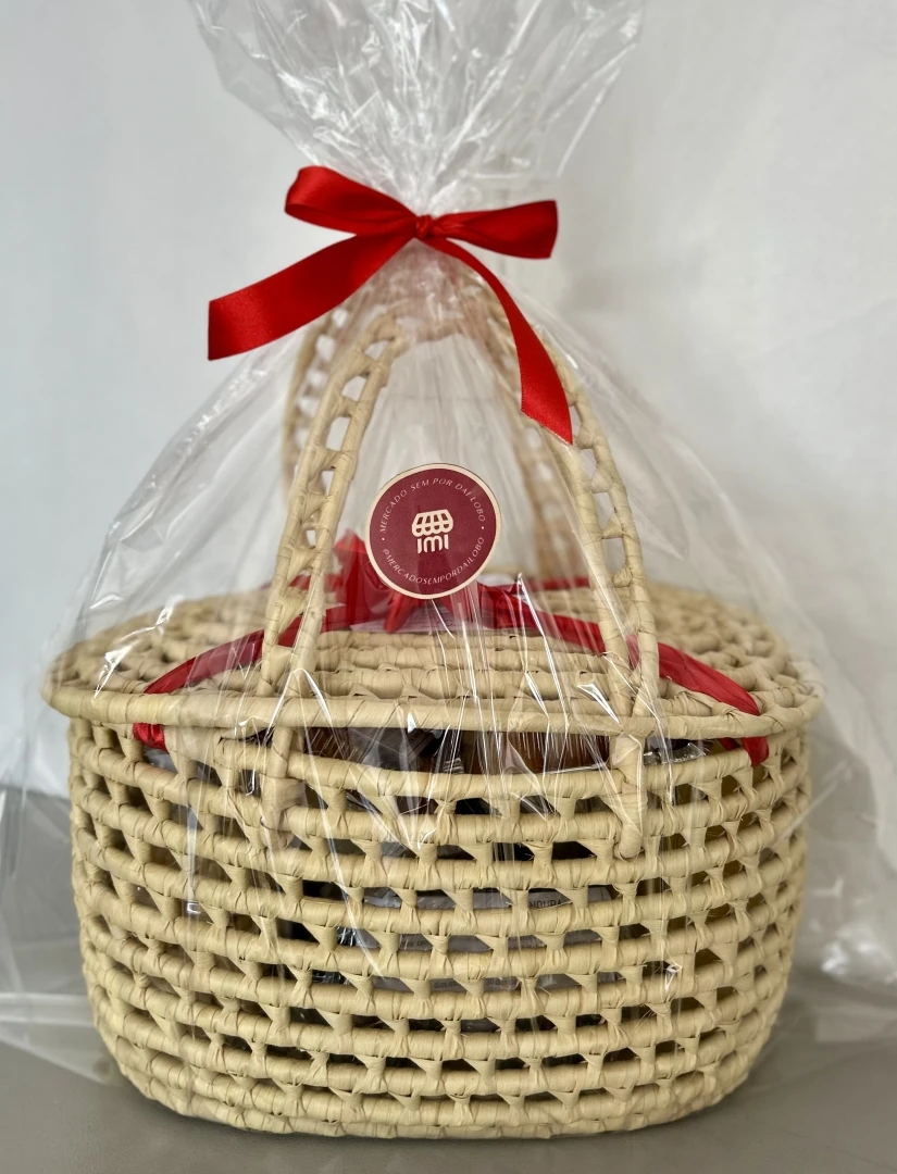 • Embalada em bolsa de palha com laço em cetim